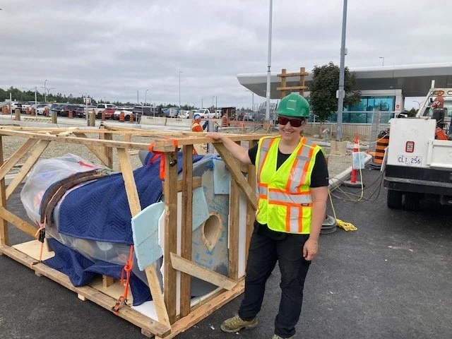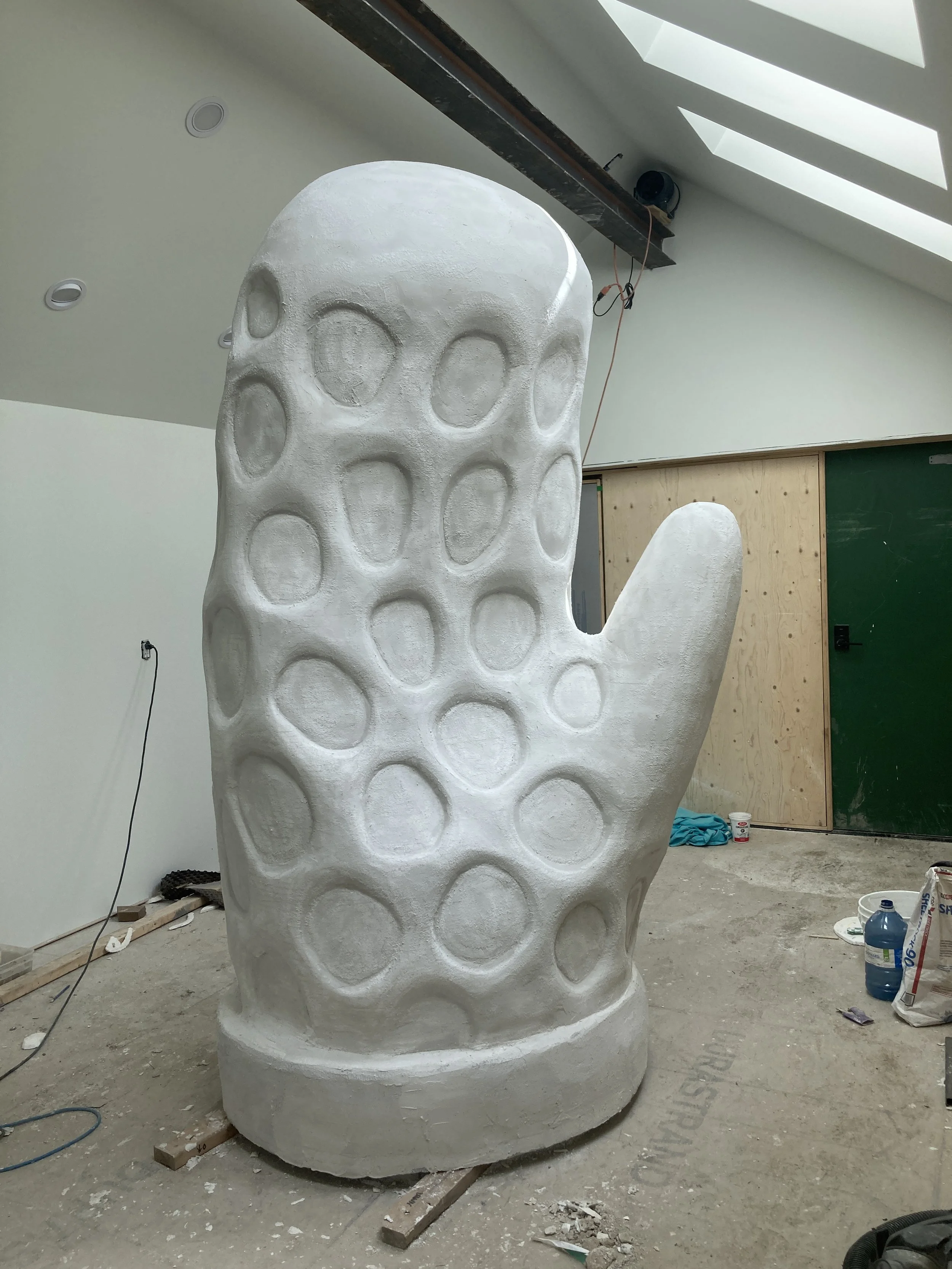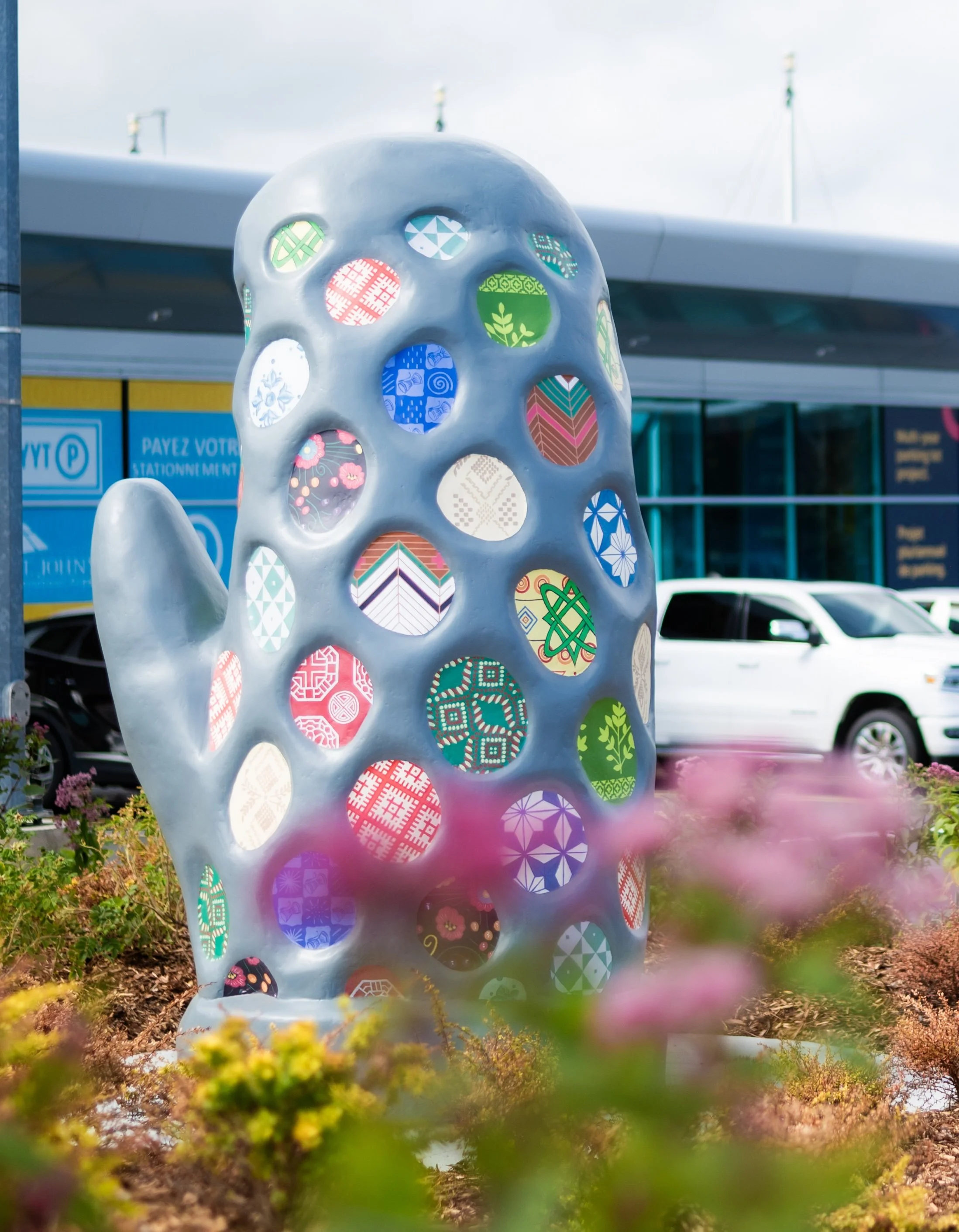 Mittens in Newfoundland are particularly distinctive in their shape and patterns. A mitten is an understated, humble article of clothing signifying warmth and comfort. A knitted mitten carries the maker within it. The patterns on a mitten hold history, place, and stories. This friendly oversized mitten gestures a hello or goodbye to the airport’s visitors. Within the mitten are various textile patterns that represent diverse cultures that now call Newfoundland home.