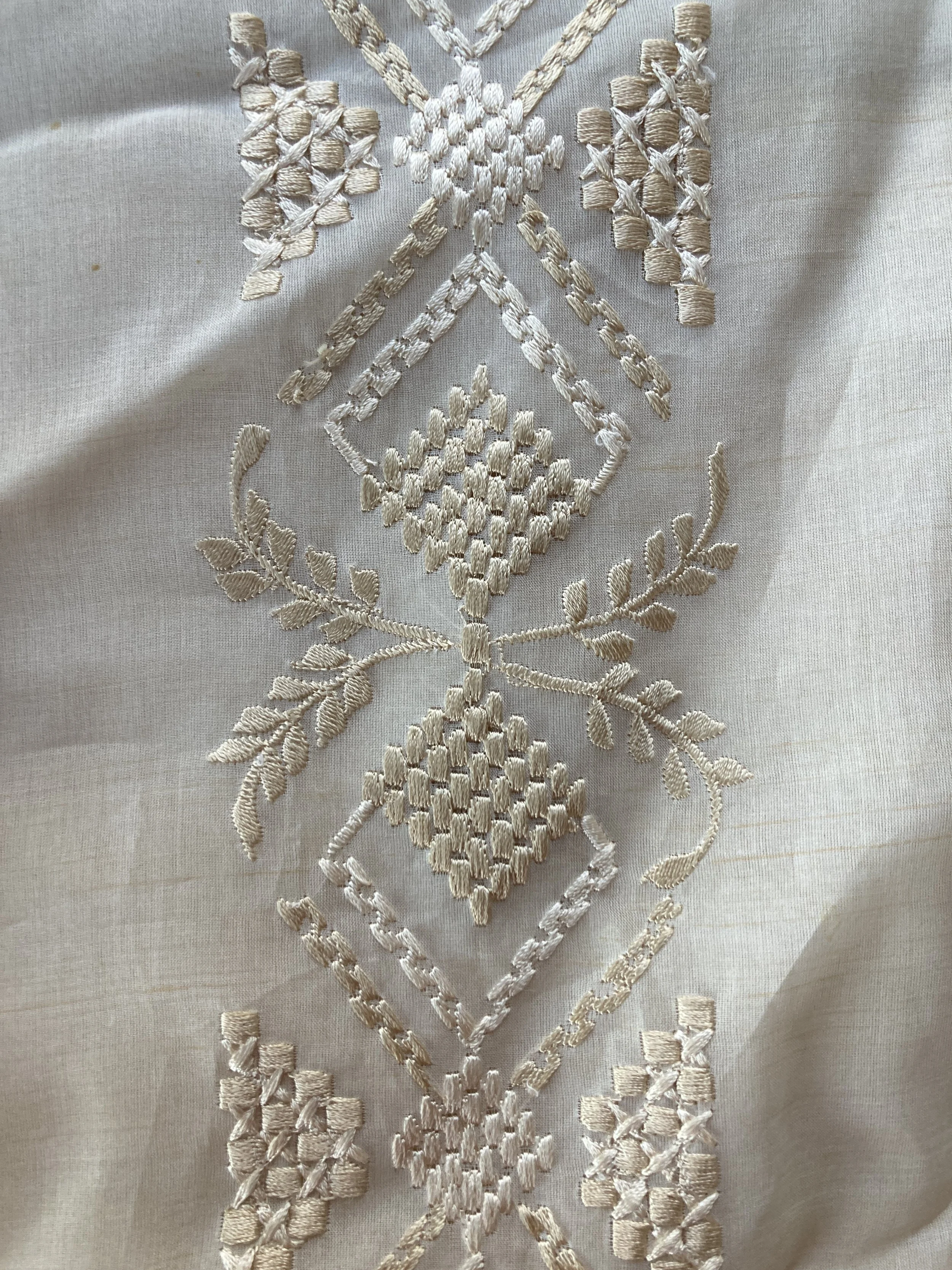 The design is from the embroidery on the Barong Tagalog that was worn and outgrown by Mary Ann's youngest son. The Barong Tagalog is a formal, long-sleeved embroidered shirt and the national dress of the Philippines for men. It is worn in both informal and formal occasions such as weddings and national festivals. The Barong Tagalog combines pre-colonial Filipino and Spanish influences in its design and construction.