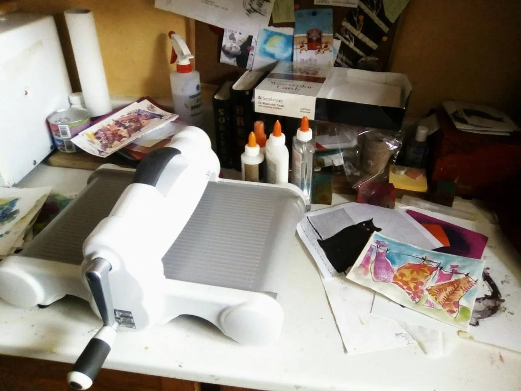 Artist Janet Peter, who specializes in paper mache, print-making and fibre art, shares a photo of one of her at-home workspaces.