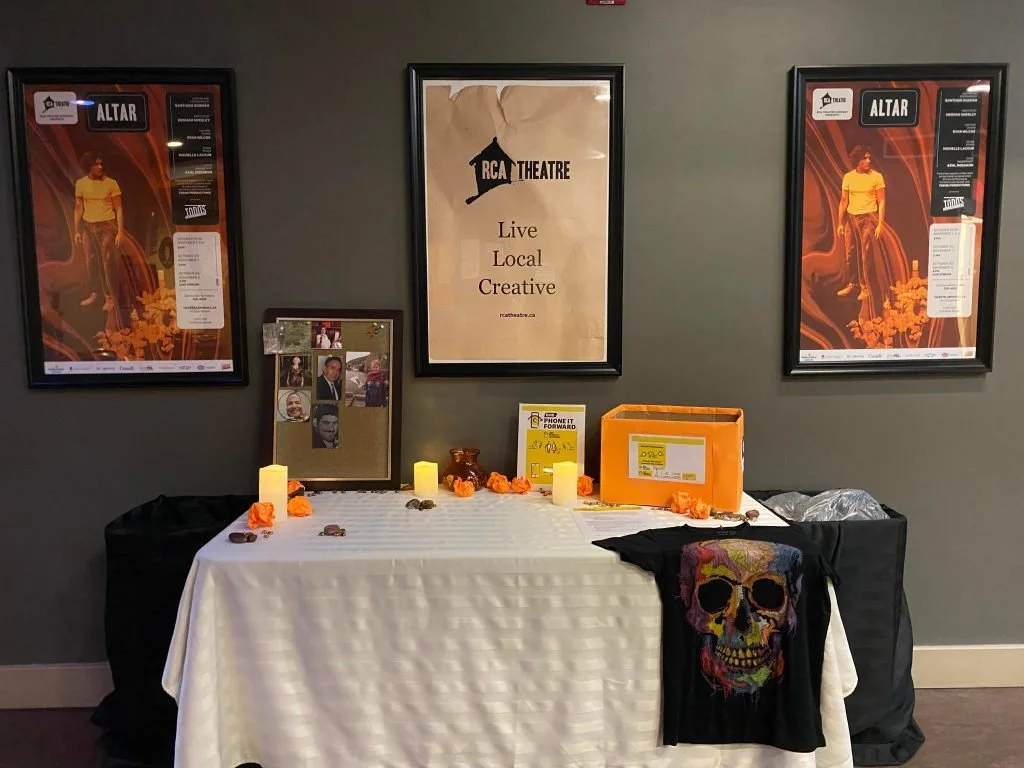 But this isn’t the only way in which “ALTAR” strives to give back to the community. The team has also set up a community altar in the Cox & Palmer Second Space to receive donations (everything from clothing and small household items to shampoo and non-perishable food items) for local organizations including the Canadian National Institute for the Blind (CNIB), The Gathering Place, the St. John’s Women’s Centre, and Bridges to Hope. (Click here to see a list of requested items.) The community altar also invites theatre goers to participate in Día de Muertos by bringing along a photo of a departed loved to place on the pin board to remember and celebrate them.
