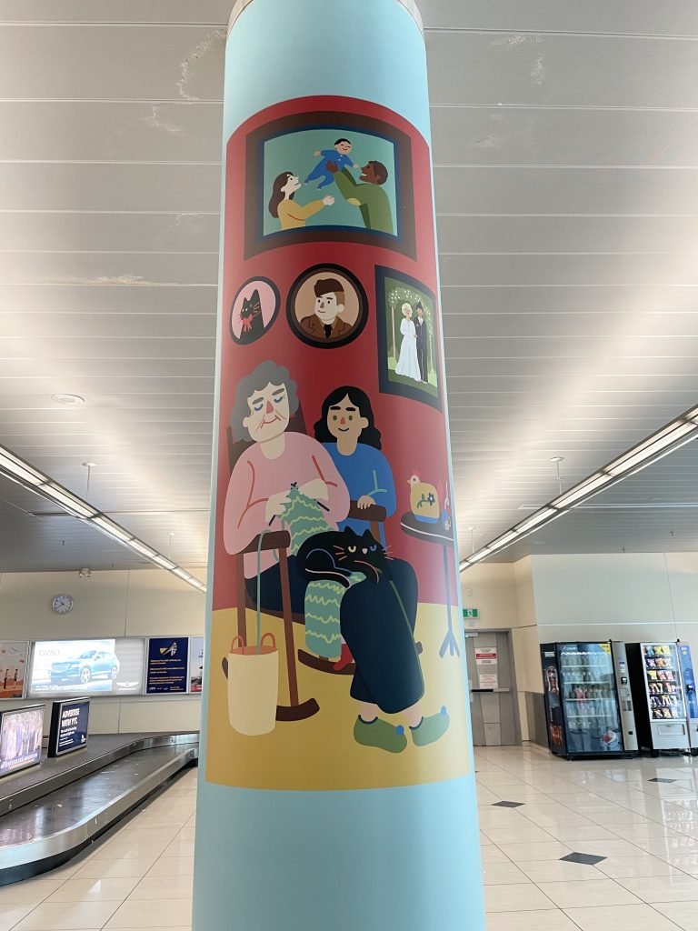 In the end, almost 40 submissions were received and reviewed by a section committee consisting of Airport staff, a representative from the funder, and members of the local visual arts community. Ultimately, Molly Margaret was chosen for her vibrant, whimsical and inclusive designs. Her artwork covers eight columns and features 24 scenes that capture the spirit of the province, including boil-ups, catching capelin, hanging clothes on the line, kitchen parties, music-loving mummers and more, as well as local flora and fauna.