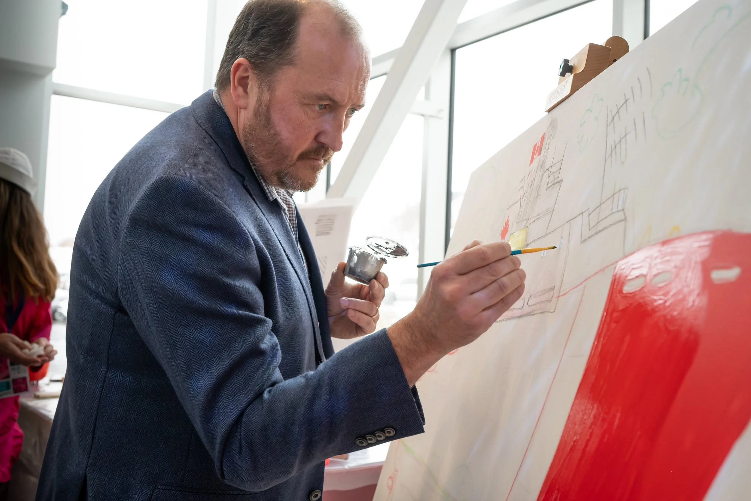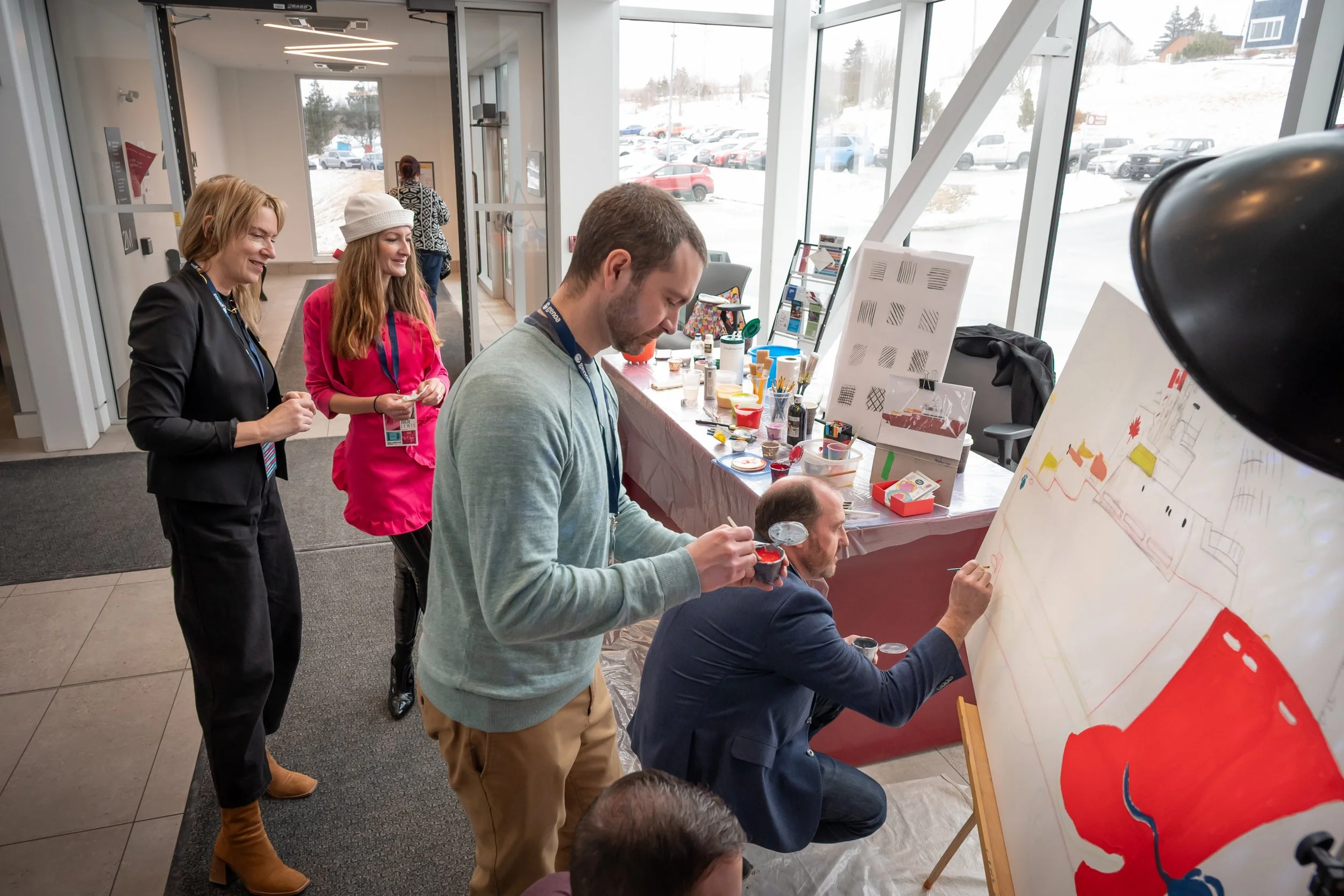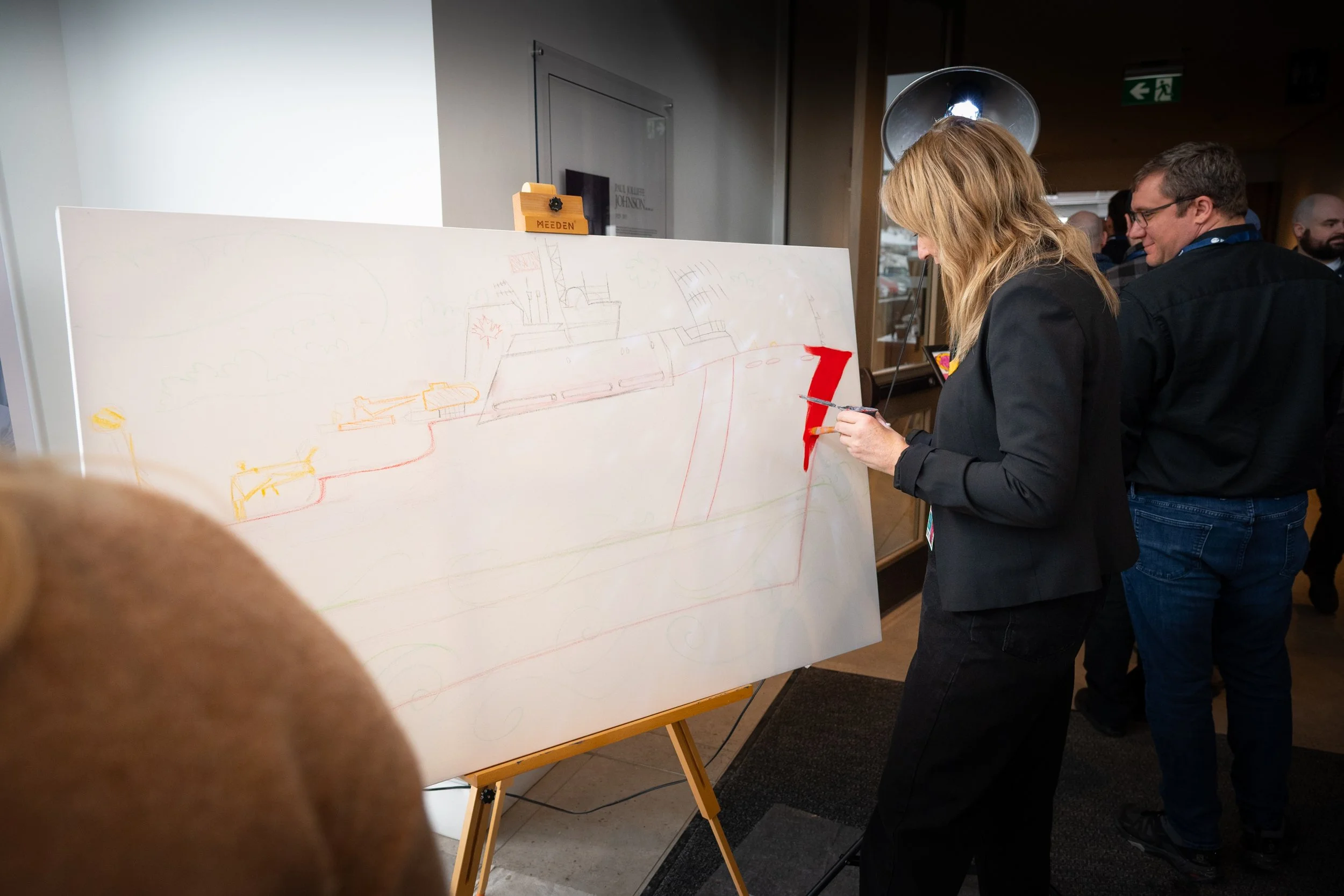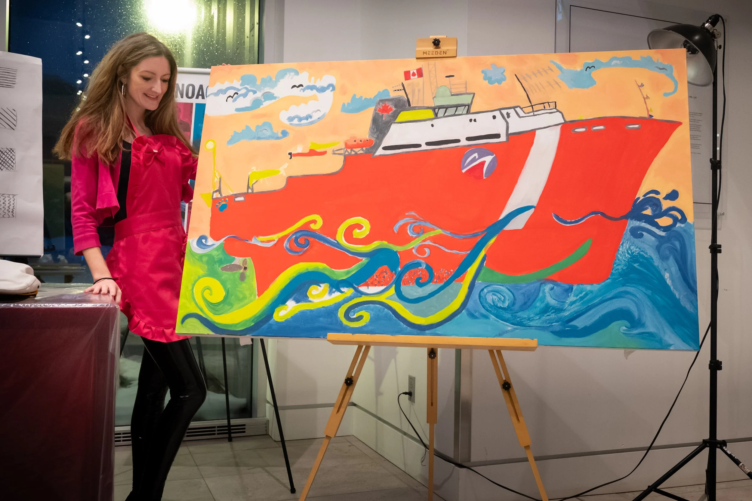 Stationed in the lobby outside the conference room, Lewis led participants through a group project, where they painted a large illustration of a boat modelled off of one of the company's Coast Guard vessels.