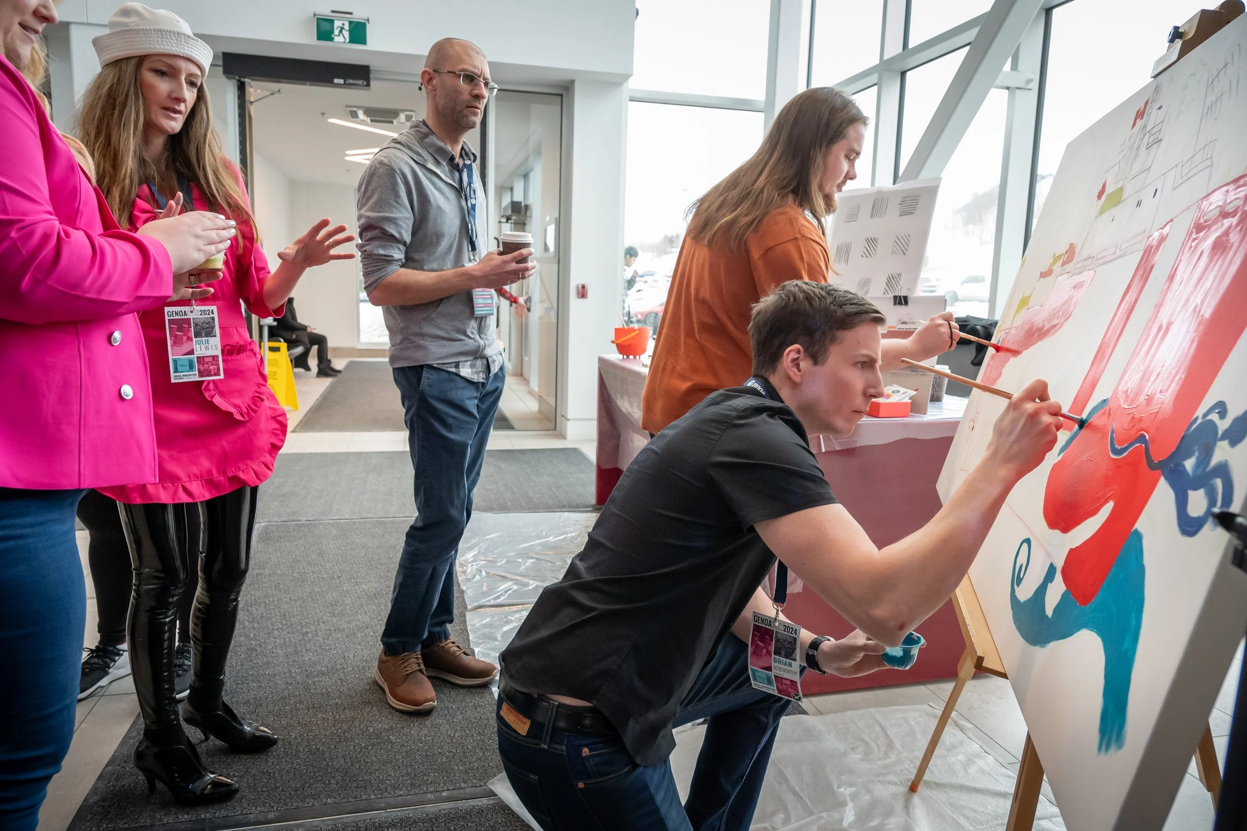Genoa Design’s CEO, Gina Pecore, tries her hand at the group painting project during GenoaCon 2024 at the Emera Innovation Exchange in St. John’s. Photo: James Lewis Pictures