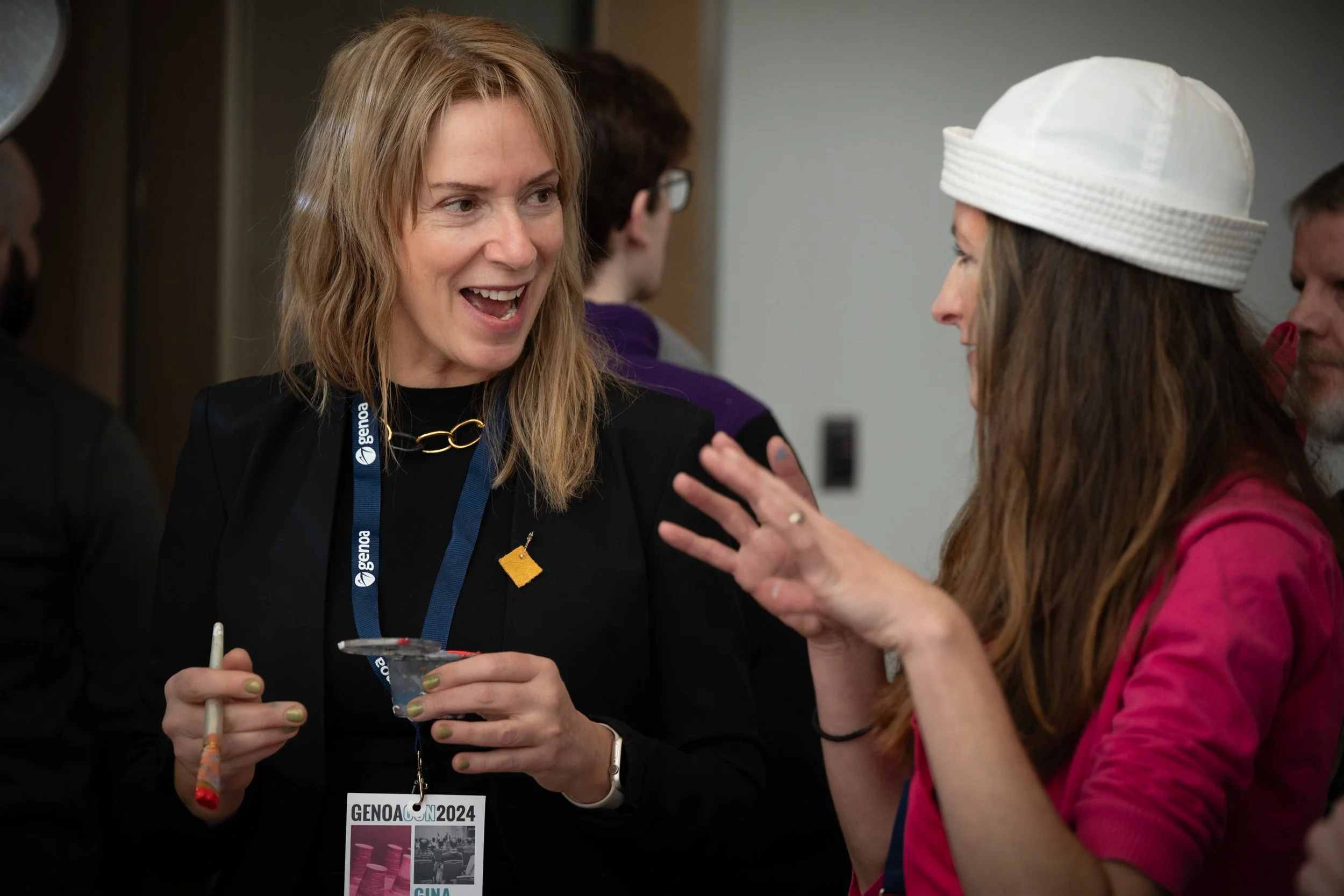 Genoa Design CEO Gina Pecore (left) and artist Julie Lewis enjoy a chat during the group painting project. Photo: James Lewis Pictures