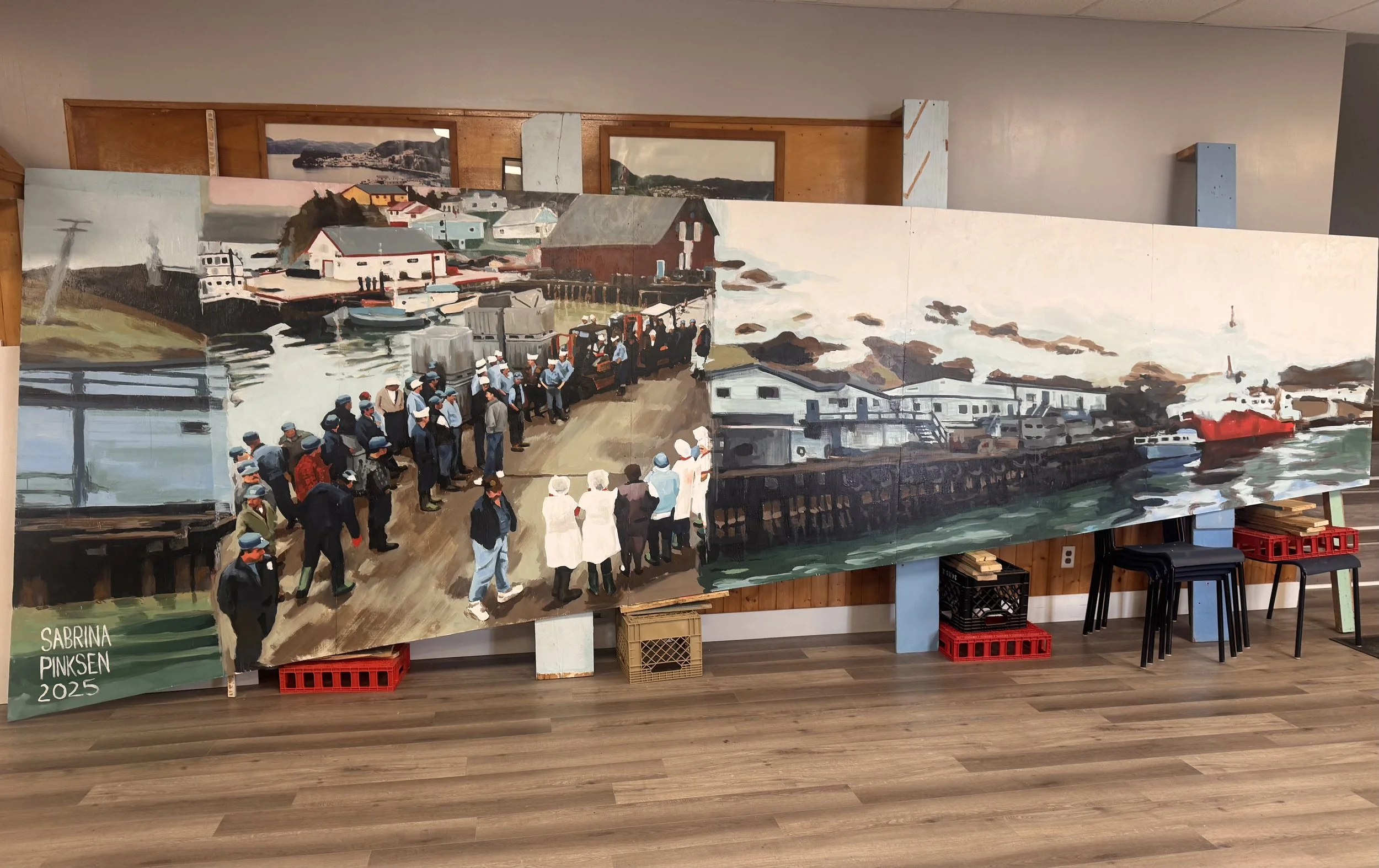 Featuring six scenes that tell the importance of the town's former fish plant and those who made a living there, locals having a yarn down by the water and more, Pinksen (working from archival photos) painted the individual panels inside the community centre before they were affixed to the building, inviting members of the town to come by, have a chat and see the creative process unfold.