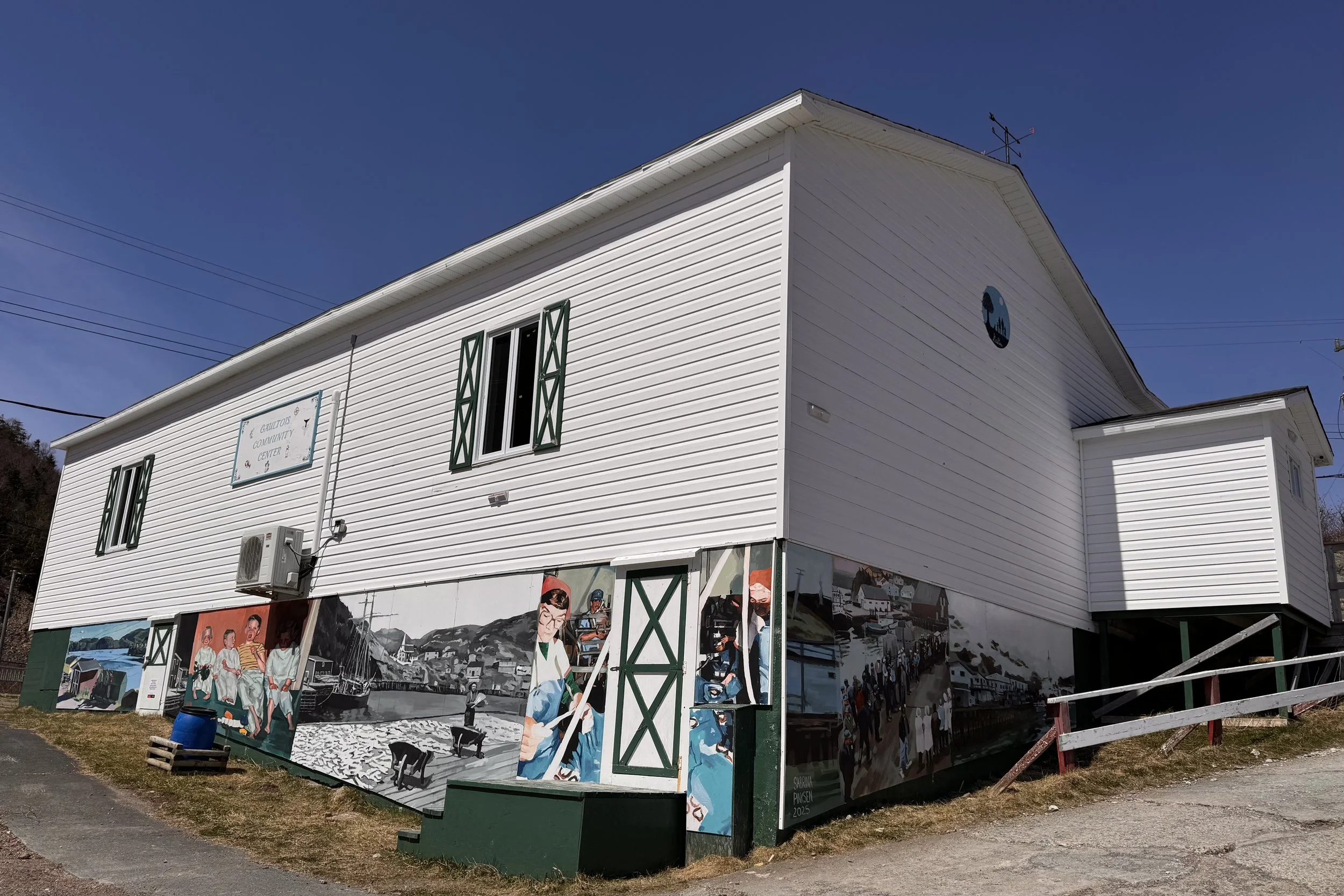 A panel from Pinksen’s mural, featuring four local residents, sits on display inside the Gaultois community centre.