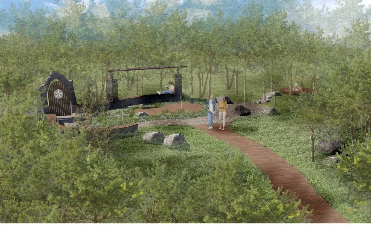 The Sandra Dobbin Memorial Garden will be a heavily shaded sunken garden tucked among the trees, with lush ground cover and gravel walkways. This healing and resonant space will evoke feelings of connection and spirituality, serving as a contemplative sanctuary where visitors can meditate and reflect. The garden will feature a variety of structural elements, including floating circular wooden meditation platforms, an elevated boardwalk, retaining benches, and a covered pergola structure that stylistically reflects the Dobbin house in Beachy Cove, offering visitors a sheltered place to sit depending on the weather. The garden is designed as a secluded refuge immersed in nature, offering respite and fostering community connection through cultural programming, grief work, and quiet contemplation.