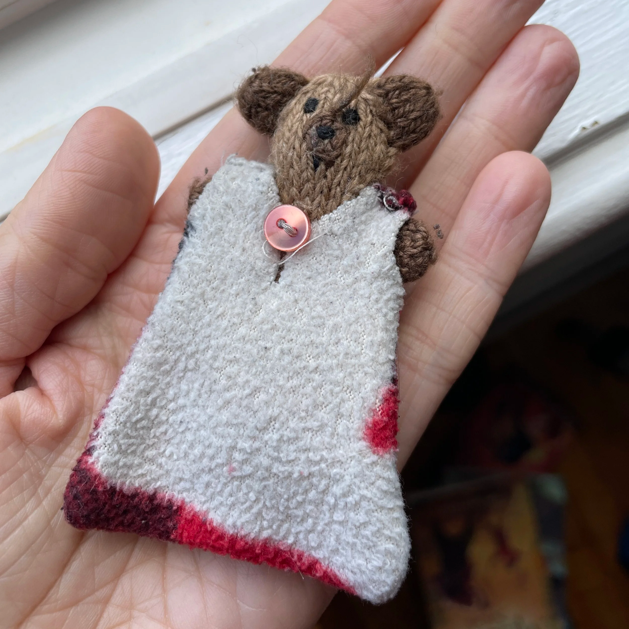 These teddy bears (“Cinnamon” is shown here) are made from Fair Trade finger puppets, and then dressed with a sleep sack to match their owners’.