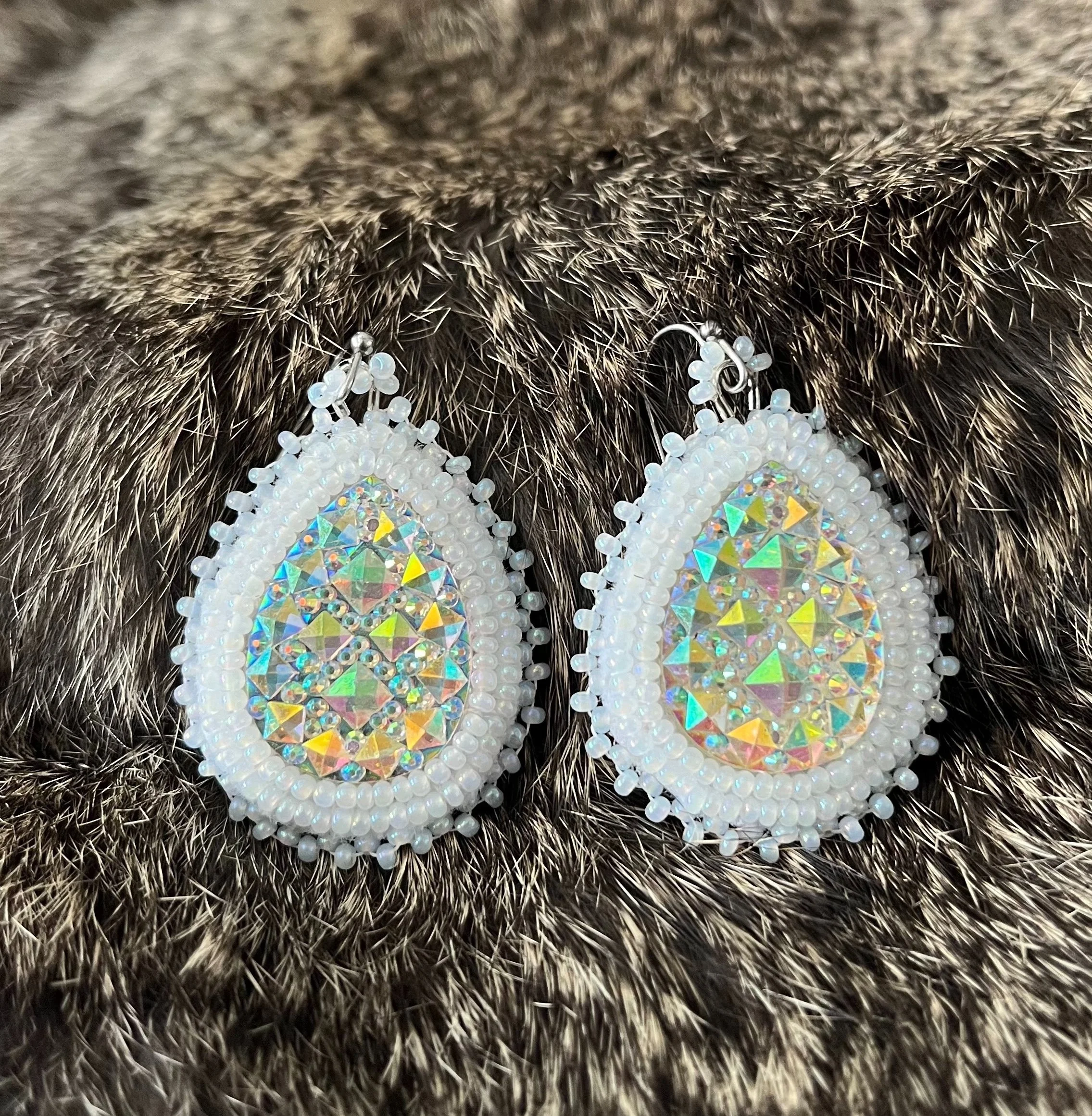 These earrings are teardrop shaped dangles on stainless steel hooks. The earrings are beaded with white iridescent beads around a shiny centre with edging in the same colour beads. They capture the light beautifully, and are perfect for a holiday party or for gifting.